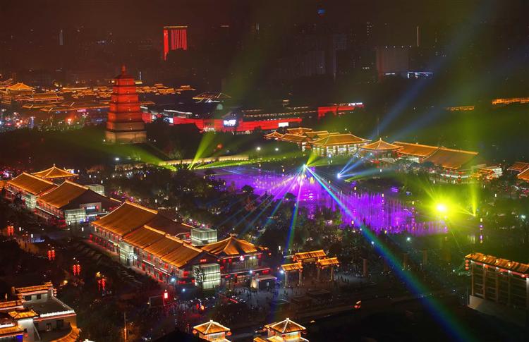 俯瞰大雁塔北广场流光溢彩。