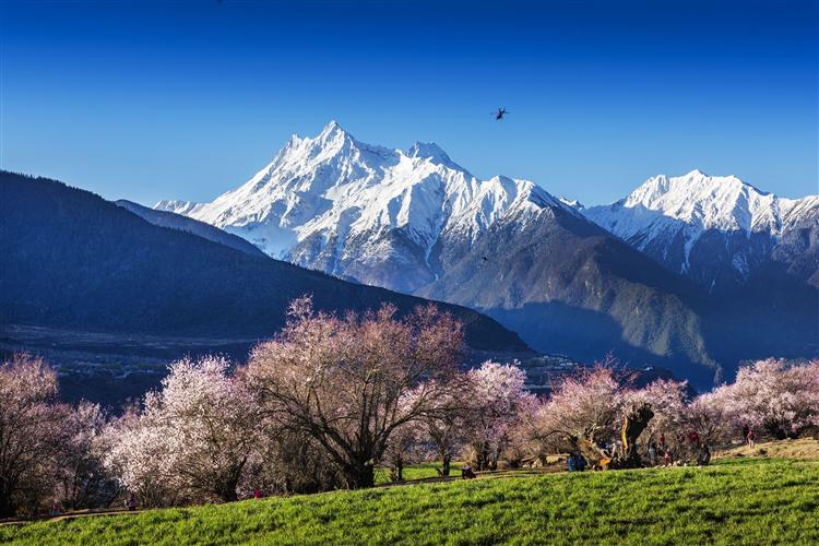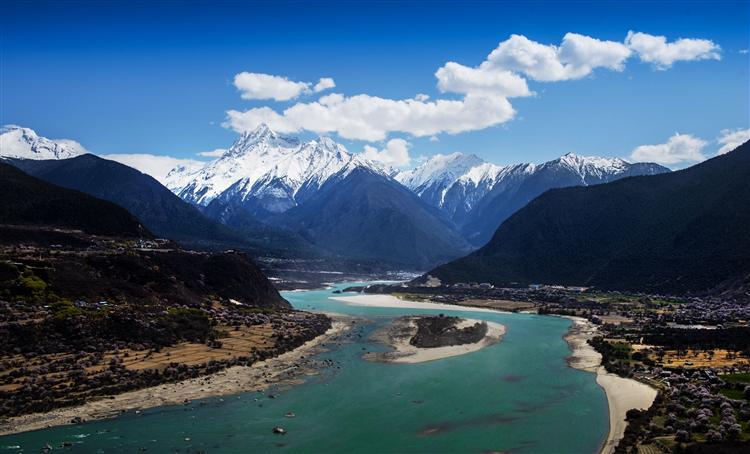 吞白村,坐落在雪山脚下,雅鲁藏布江北岸,东北邻索松村,山水相依,山环水绕。从村里望去,壁立千仞的南迦巴瓦峰,雄姿英发,高耸入云,如圣洁的神 女,优美的倒影,在雅鲁藏布江水的映衬下,如油画一样具有质感。碧绿的水,高耸的山,雅鲁藏布江两岸成片的野桃树,花开烂漫,迎风舒展,把这里的春天点缀得如诗如画。