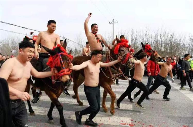 一阵鞭炮咚咚震响,北社骑在骡子背上的小伙起身站在骡子背上,唿哨吹起,东社的姑娘们也站在骡背上,发出尖叫声。扛车的几个青壮年驾着骡车,赤膊上阵,放开脚步在路上恣意狂奔。此时,锣鼓声、鞭炮声、车上的铜铃声、骡子的嘶叫声,观众的喝彩声响成一片,如同暴风骤雨一般,看得人心惊肉跳。